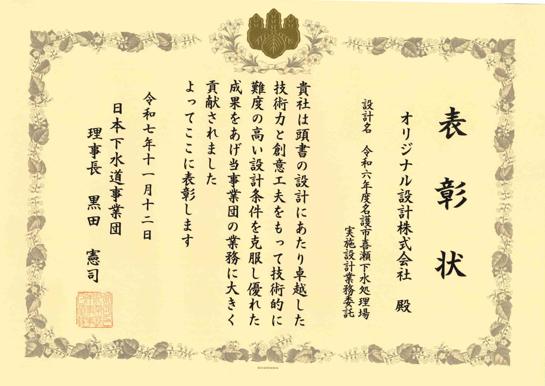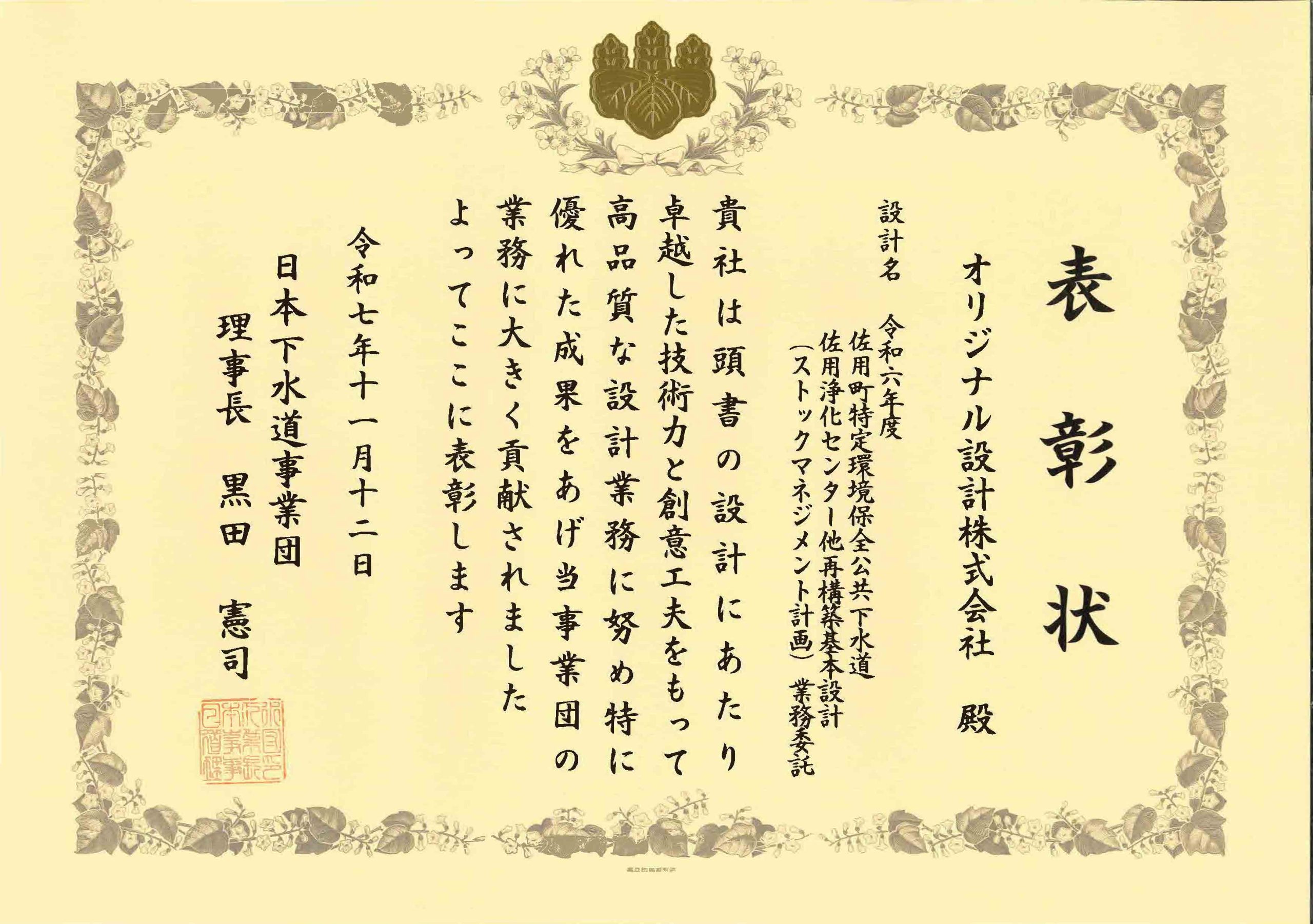このたび、日本下水道事業団(JS)より、令和6年度に完了した設計等業務委託の中から 技術力・創意工夫等により優れた成果をあげた設計として 当社が実施した下記の業務が優良設計に選定され 日本下水道事業団理事長表彰を受けましたのでご紹介いたします。